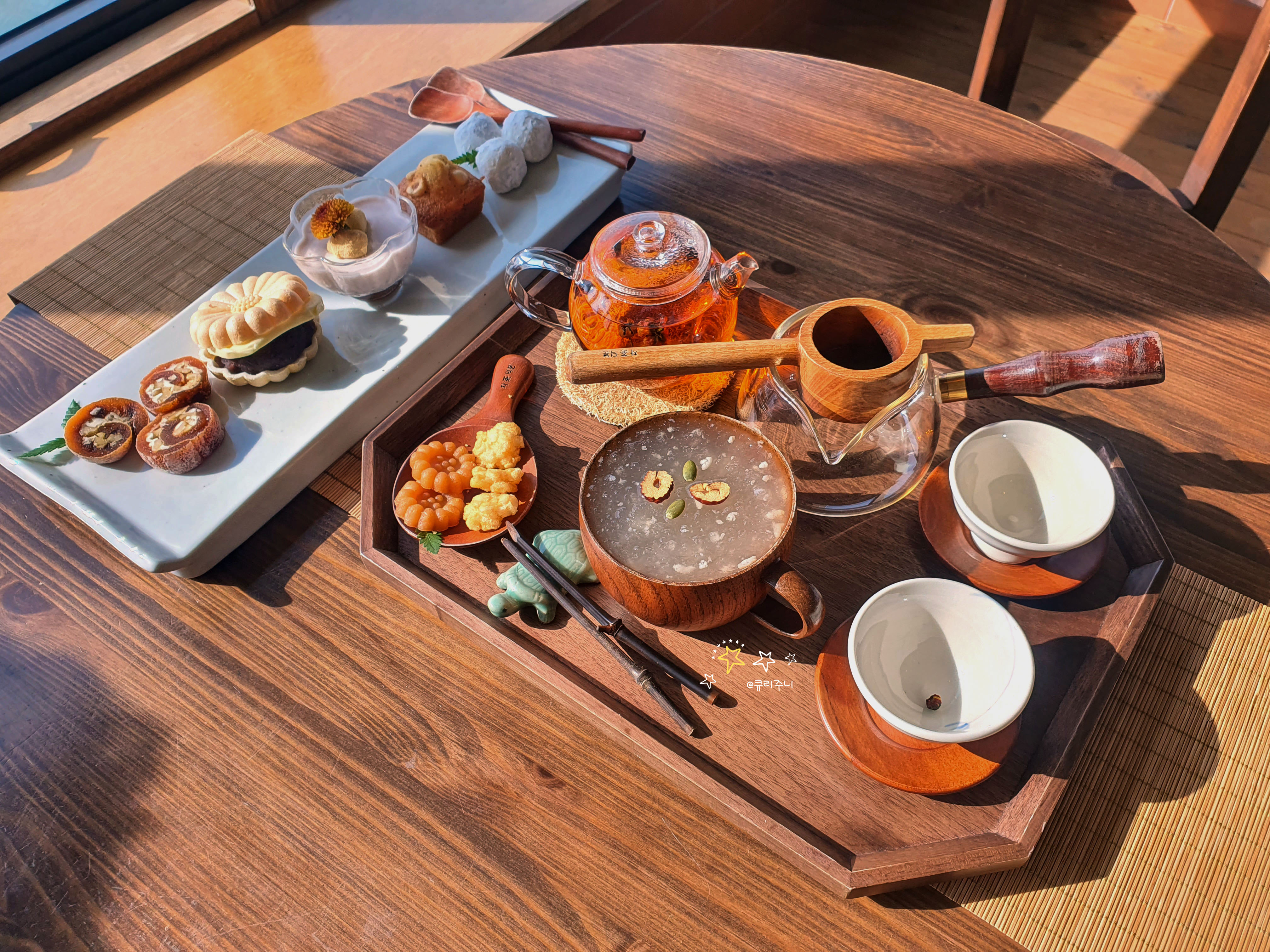 차덕분은 일반 카페와는 달리 전통차와 빙수, 다과를 판매하고 있으니 평소와는 다른 색다른 다과를 즐겨보시길 바랍니다. 다과상 한상차림은 호두곶감말이, 앙버터모나카, 미니찹쌀떡, 앙금핀나코타, 휘낭시에가 한 상에 나옵니다.