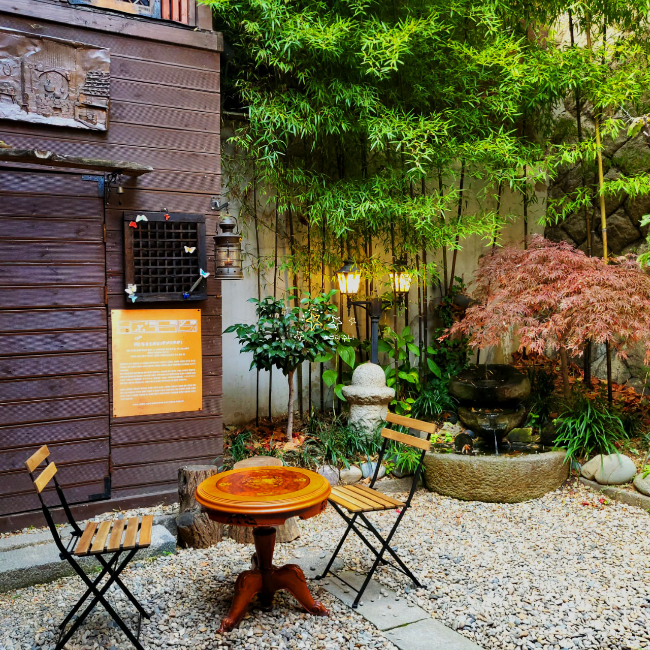 관동오리진 카페 뒷뜰로 나가보면 조선시대 말기에 사용했던 말구유를 활용해서 만든 물돌이가 있습니다. 그 옆에 작은 석등은 일본 현지에서 진짜 사용되었던 것으로 현장감을 느끼실 수 있습니다.